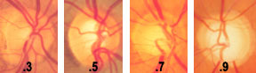 The above photos show progressive optic nerve damage (indicated by the cup to disc ratio) caused by glaucoma.